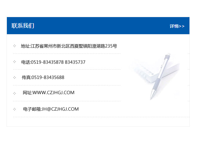 地址:常州市新北區友邦商務大廈1幢16、17層  電話:0519-85101652  傳真:0519-85112595  郵編:213022  網址:www_cz-jiayue_cn.ylccn.com  郵箱:xiajifengaa@163.com